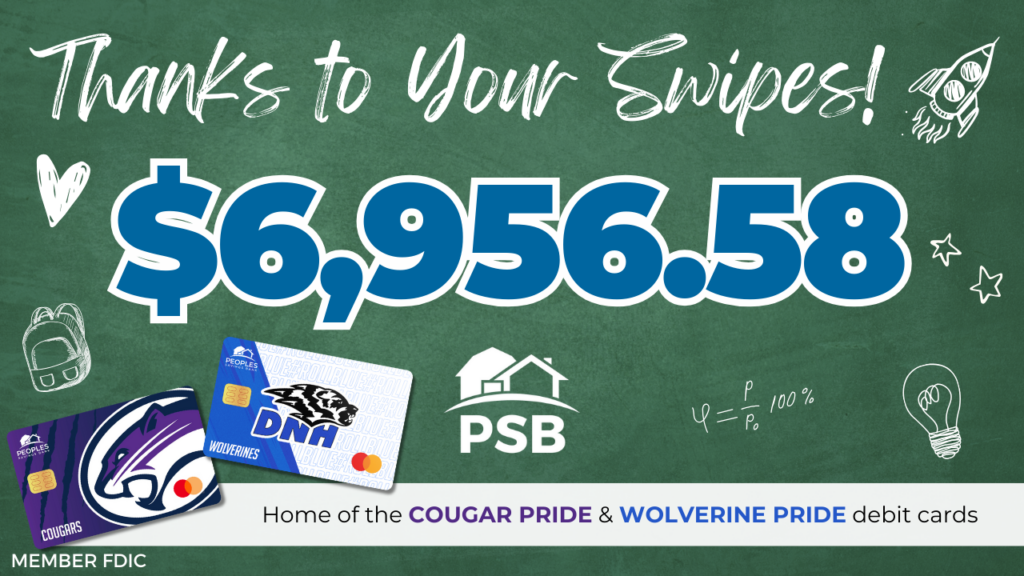 Show some school pride with your COUGAR PRIDE or WOLVERINE PRIDE debit card from PSB! We donate 6 cents to the school for every swipe. Thanks to your 115,943 swipes, we are able to give back almost $7,000 to AGWSR and DNH schools combined in 2025.